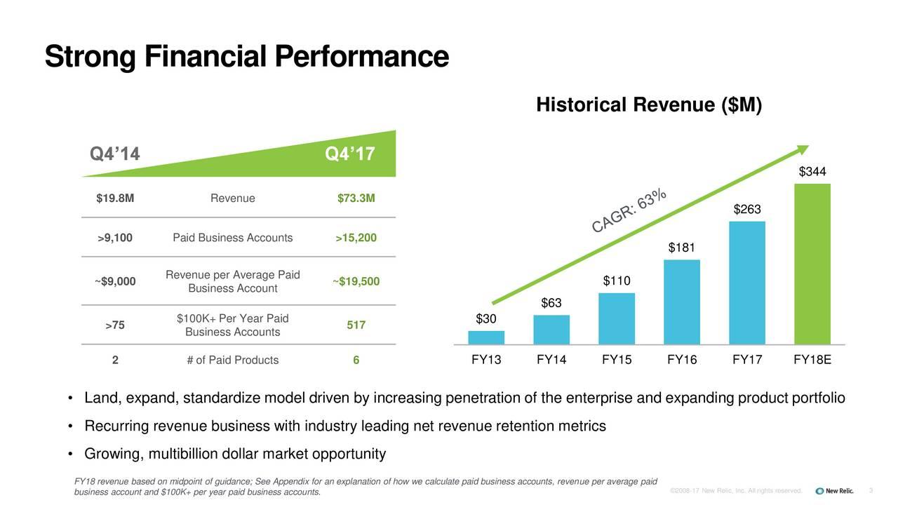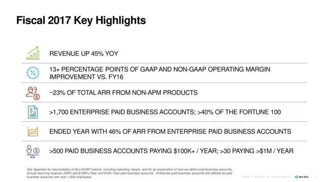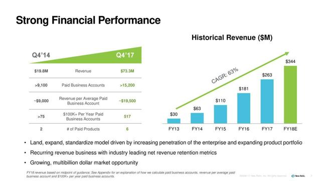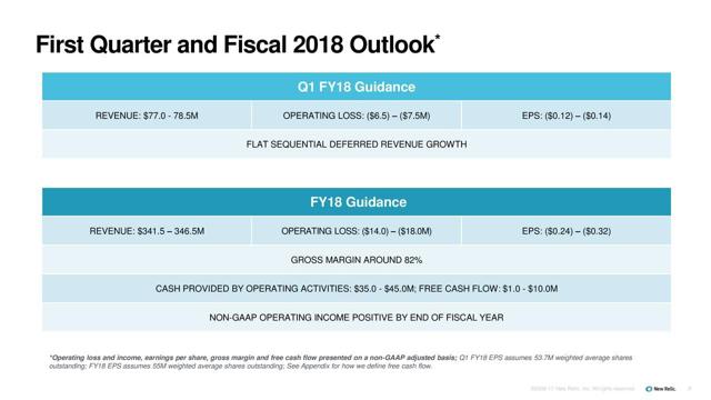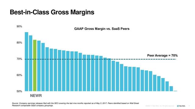 As I mentioned in the opening, I don't like to buy stocks without earnings and almost never stocks with losses into the great unknown. New Relic, however, recently gave guidance that on a non-GAAP basis, it will be profitable by the end of FY 2018. That is impressive for such an early and fast-growing enterprise. This is due to its scalability of growth and its large gross margins.
