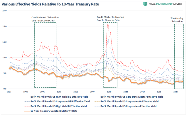 I have written for some time that during the next market reversion, the 10-year rate will fall towards "zero" as money seeks the stability and safety of the U.S Treasury bond. However, corporate bonds are an entirely different issue. When "high yield," or "junk bonds," begin to default in great numbers, as they always do in a recession, which is why they are called "junk bonds" to begin with, investors will face sharp losses on the one side of their portfolio they "thought" was supposed to be safe.