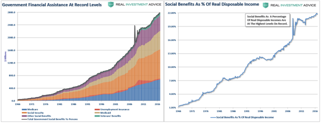 Importantly, for the average person, these social benefits are critical to their survival as they make up more than 22% of real disposable personal incomes. With one-fifth of incomes dependent on government transfers, it is not surprising that the economy continues to struggle as recycled tax dollars used for consumption purposes have virtually no impact on the overall economy.