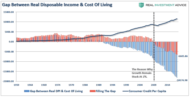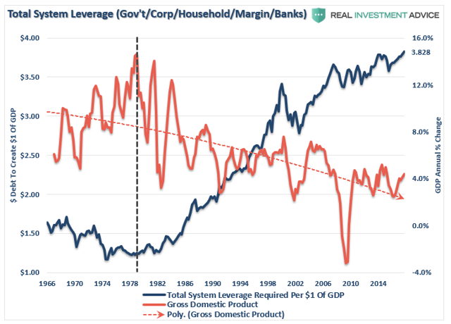 Yes, current economic growth is good, but not great. Inflation and interest rates currently remain low, which creates an environment in which using debt remains opportunistic. But rising debt levels have a negative economic consequence. As shown, prior to the deregulation of the financial industry under Ronald Reagan, which led to an explosion in consumer credit issuance, it required just $1.25 of total system-wide debt to create $1.00 of economic growth. Today, it requires $3.83 to create the same $1 of economic growth. This shouldn't be surprising, given that "debt" detracts from economic growth as the required "debt service" diverts income from savings and productive investment leading to a "diminishing rate of return" for each new dollar of debt.