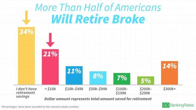 Of course, that dependency ratio is directly tied to financial insolvency of the vast majority of Americans. According to a Legg Mason Investment Survey, US "baby boomers" have on average $263,000 saved in defined contribution plans. But that figure is less than half of the $658,000 they say they will need to retire. As noted by GoBankingRates, more than half of Americans will retire broke.