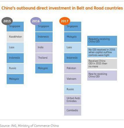 - Investment: Chinese corporates' direct investment was $14.36 billion in 2017 to countries along the Belt and Road, down 1.2% from 2016. Belt and Road accounted for only 12% of outward investment in 2017. Most of the money was invested in Singapore, Malaysia, Laos, Indonesia, Pakistan, Vietnam, Russia, the United Arab Emirates and Cambodia.