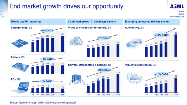 This slide shows the expected revenue growth out to 2025 for the end markets of the semiconductor industry: