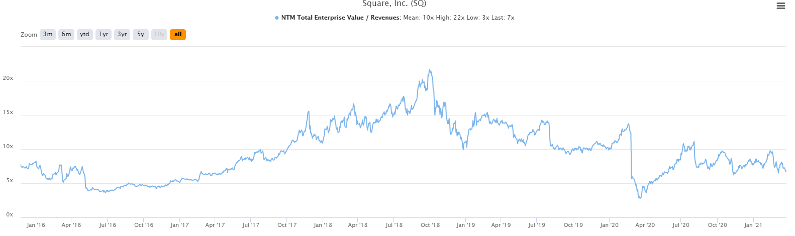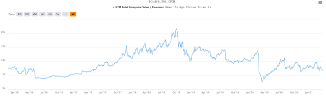 Square's peak valuation was three years ago when it hit an eye-watering 22X forward sales. Today, shares go for ~7X forward sales, which is well below its long-term average multiple of 10X. It is difficult to say a stock with a forward sales multiple of 7 is cheap, but in this case, it seems to be. Investors have proven willing to pay much more for this stock, even very recently, and with Square's growth having been accelerated by the events of 2020, I don't see why it cannot trade for 10X sales again.