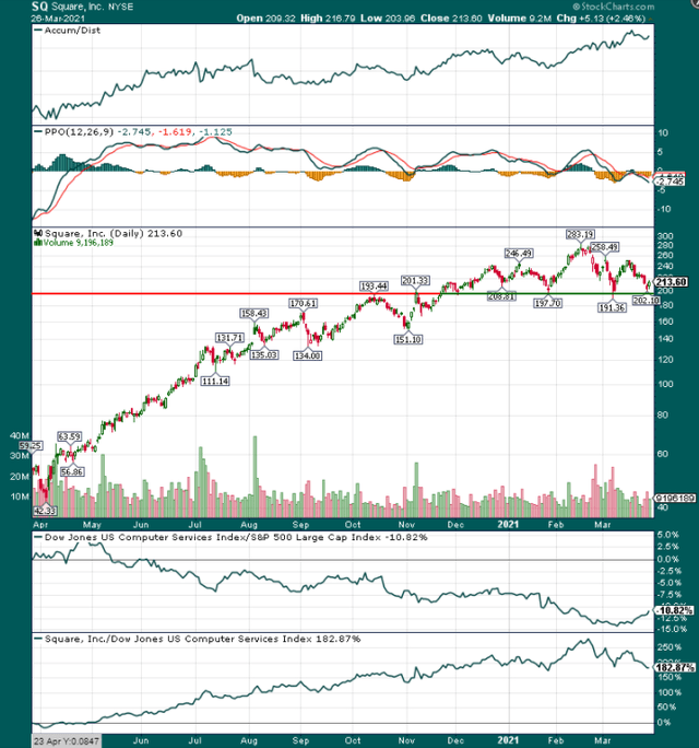 Finally, the accumulation/distribution line has never wavered and has indeed strengthened during the selling in the past six weeks or so. That means people are buying the dips, taking the opportunity to add on weakness. That's bullish as well, and with the weight of the other evidence pointing to a likely bottom having been struck, I think Square looks good for a buy.