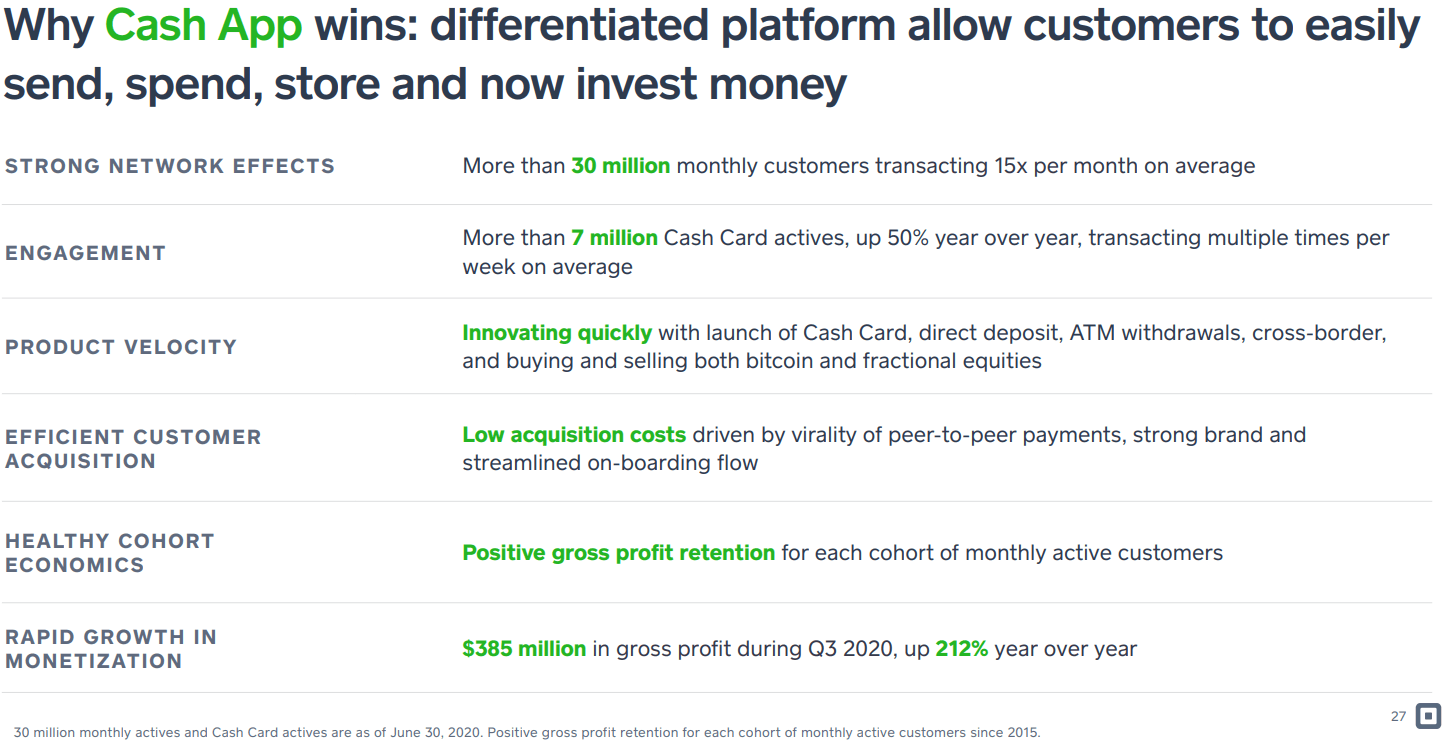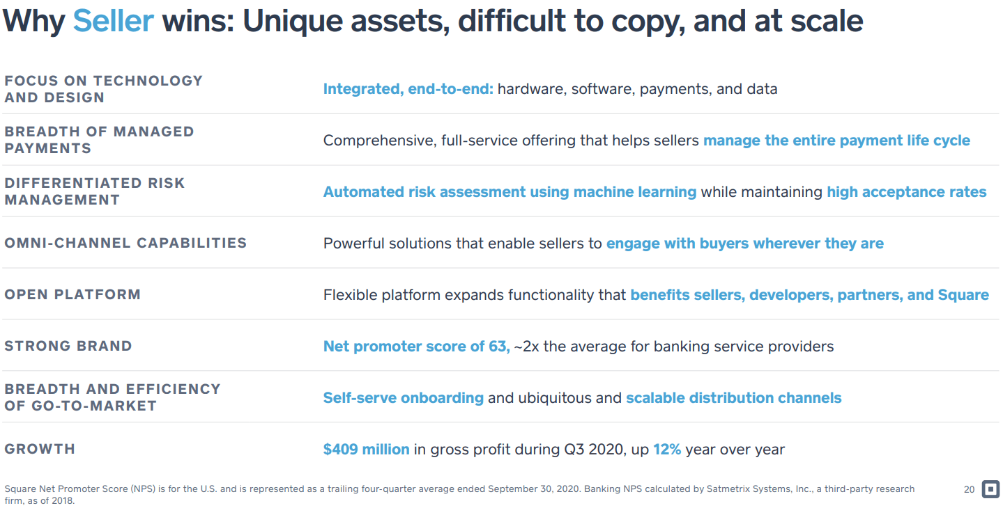 You can read the points yourself but the idea is that Square is not just an app that does one thing; it's a full service business solutions provider, and as it scales, that will allow further investment in this ecosystem and strengthen its competitive position. And, as customers find more value in the full suite of services, they become more valuable over time for Square.