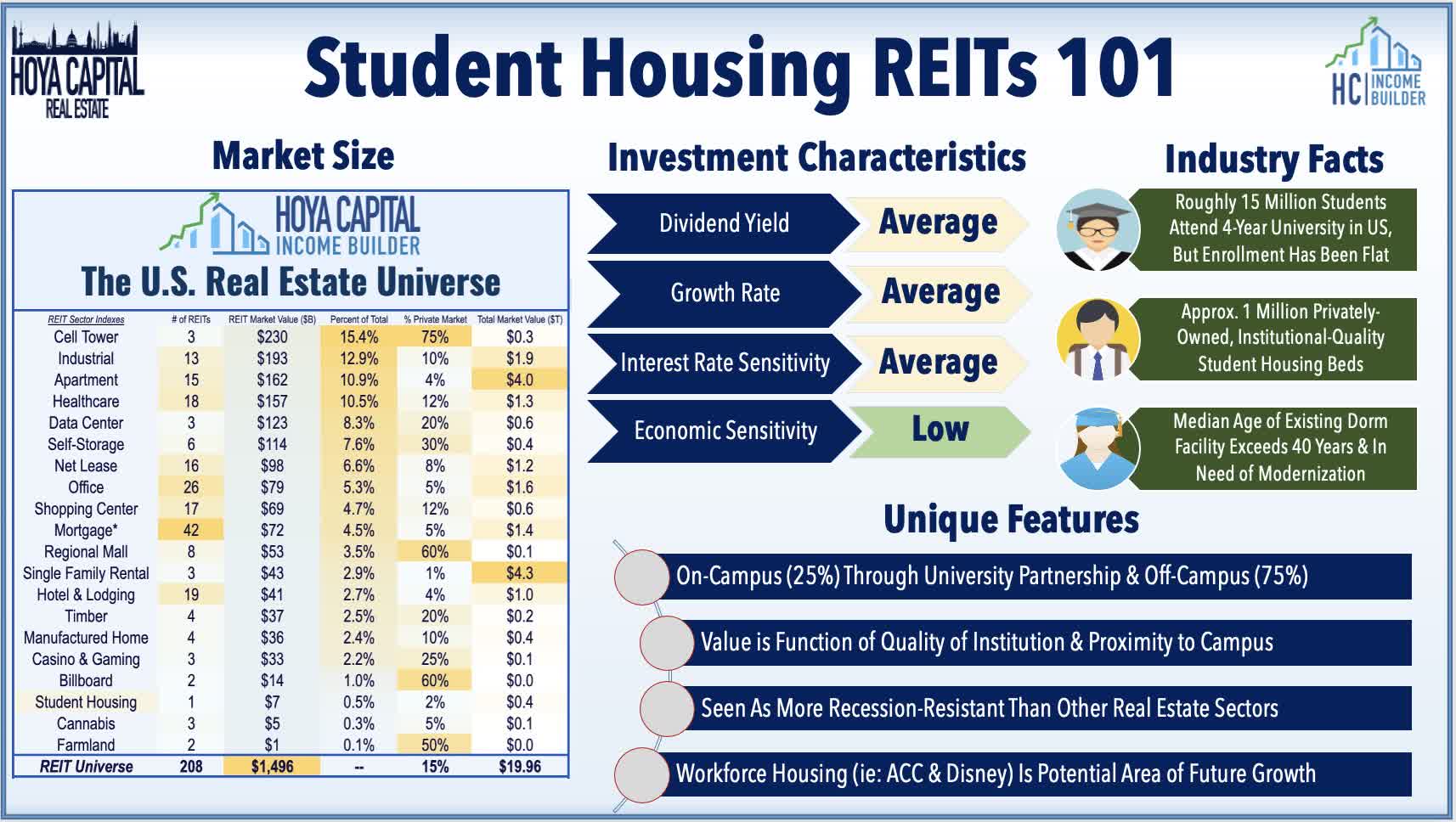 Student housing has emerged as a full-fledged asset class over the last half decade as institutional capital has flowed into the sector in search of a countercyclical asset class with a unique and uncorrelated return profile. With American Campus as the lone pure-play representative, student housing accounts for roughly 1% of the broad-based "Core" REIT ETFs.