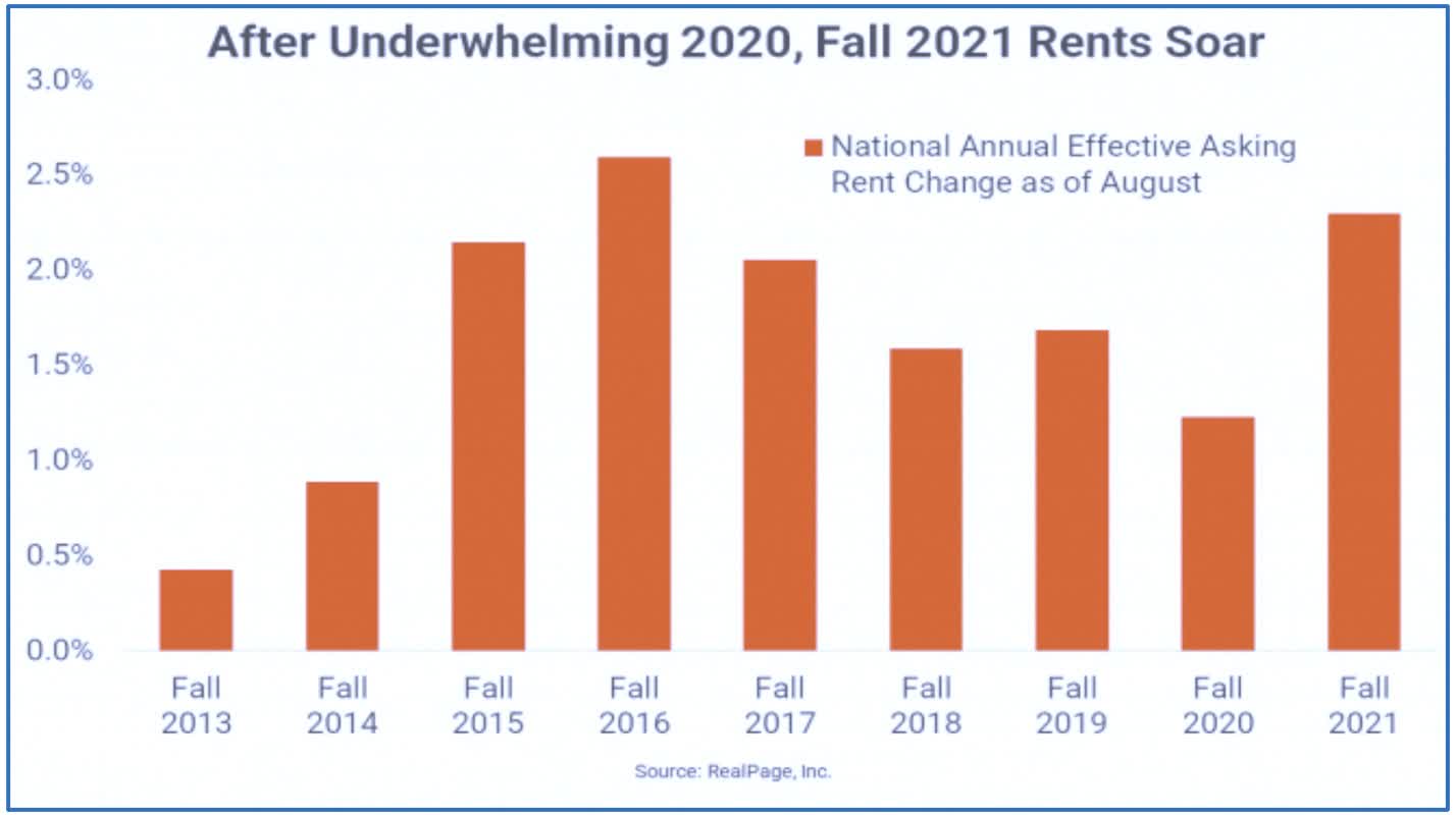 Strong results from ACC followed a slate of stellar results across the residential REIT sector as rents across essentially all property types and regions continue to soar with no signs yet of slowing down. With the majority of ACC's portfolio comprised of off-campus housing units - unaffiliated with a university - there should be an implicit level of "fungibility" or correlation with the broader non-purpose-built housing stock that appears to be under-appreciated by the market based on current valuations. Zillow reported last month that multifamily and single-family rents are soaring at the fastest pace on record. Realtor.com echoed these trends, also reporting that rents rose to record-highs in November with national rental rates growing by 19.7% from the prior year.
