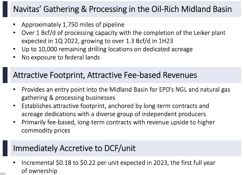 - EPD announced the acquisition of Navitas in January, giving the company access to the Midland Basin in Texas.