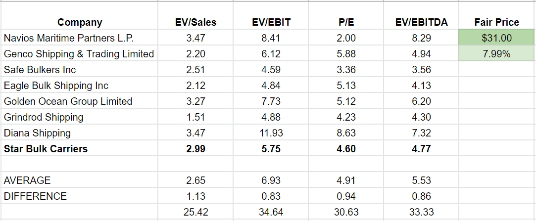 I used Competitive Companies Analysis (CCA) to evaluate SBLK stock. Comparing Star Bulk Carriers with other peer competitors and using the CCA method, I estimate that the stock is still undervalued and has around 8% upside potential to reach $31. This method reflects the real-market data and is an appropriate way of analyzing SBLK due to the company’s relative stability. Based on market cap and financial operations, I selected the dry bulk peers and used common key ratios in a CCA method to illustrate the value of similar companies. Data was gathered from the most recent quarterly and TTM data (see Table 2).