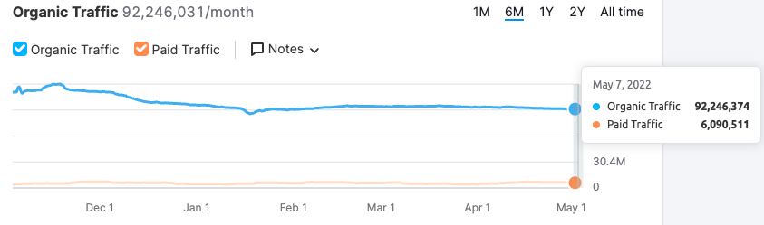 According to Jika.io, the most correlated domain is aliexpress.com, but the relationship remains relatively weak, which accounts for the company's top three domain names. Indeed, Alibaba is a technology conglomerate with many subsidiaries across e-commerce, logistics, media and entertainment, cloud computing, fintech, and other sectors. As a result, it would be debatable whether traffic analytics would be strong enough to develop a reasonable prediction.
