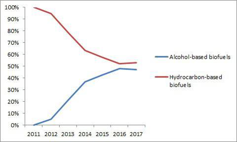 Alcohol- and hydrocarbon-based biofuels production as a percentage of total advanced biofuels production (Source: Biofuels Digest).
