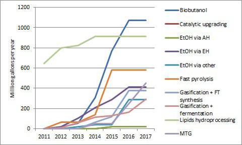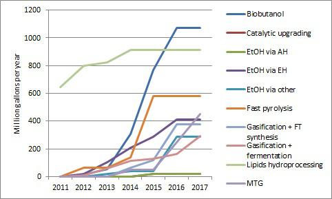 Advanced biofuels production by pathway, 2011-2017 (Source: Biofuels Digest).