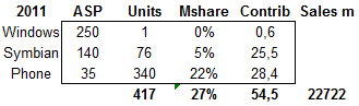 It is clear that the share of smartphones in the handset market will increase and that there is still a large potential of Nokia users that have to make this switch. The ASP will decline for the individual Nokia products, but the change in product mix is pushing up the overall Nokia ASP. Although the units sold decline significantly, sales in EUR will not decline from 2012 into 2013. I expect EUR 16 billion handset sales for 2012.