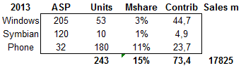Nokia "stupid phones" will see a sharp sales decline by 2015. It is hard to imagine that Nokia still sold 340m "stupid phones" in 2011, although mainly in emerging markets. Apple analysts have been salivating over this market potential. However, the gap between a 32 EUR Nokia phone and a 650 USD iPhone seems impossible to bridge on an average salary of 3000 USD. Apple is reluctant to launch an iPhone mini as it will cannibalize its overall ASP. Nokia has less trouble with lower priced smartphones. I estimate that also 25% of these sales will be converted to the Windows 8 label by 2015. This will increase the Windows 8 market share above the current pessimistic expectations.