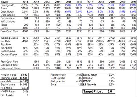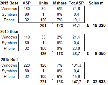 The market consensus is too pessimistic on the future Nokia ASP. Every 32 EUR phone that is swapped for a smartphone will increase the ASP by a factor 7.8. This will create a lot of value further down the valuation horizon. This is not captured in short term ratios that are used to explain the share decline. I have calculated 3 scenarios with base case, bear case and bull case estimates.