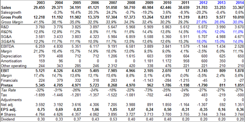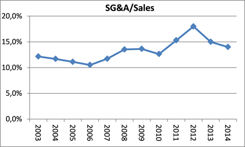 Apple makes 35% margins with this model and will struggle to keep that level. Nokia makes losses because it is overstaffed. The company already reduced FTEs by a third to 80k. The company is still too heavy and will cut another EUR billion from its payroll over the next year. As the restructuring costs decrease and the cost savings take effect, SG&A on sales should decrease below 15%.