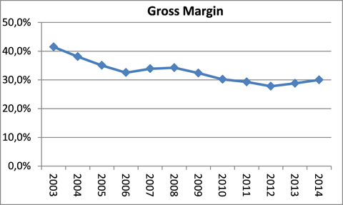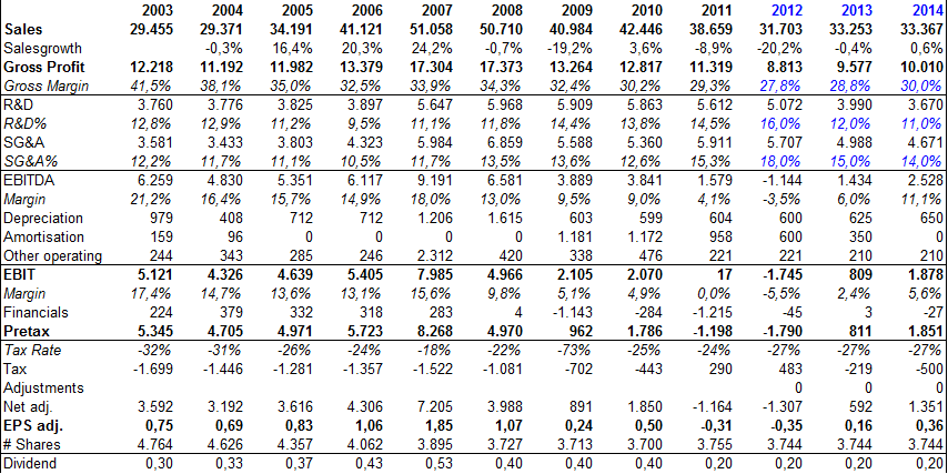 I do not expect a huge improvement in gross margins. Nokia made 40% margins when it was market leader. As a challenger, it will have to price competitively in order to build market share. This is why I do not believe that Nokia will make double digit EBIT margins ever again. The gross margin stabilizes as non-performing models disappear.